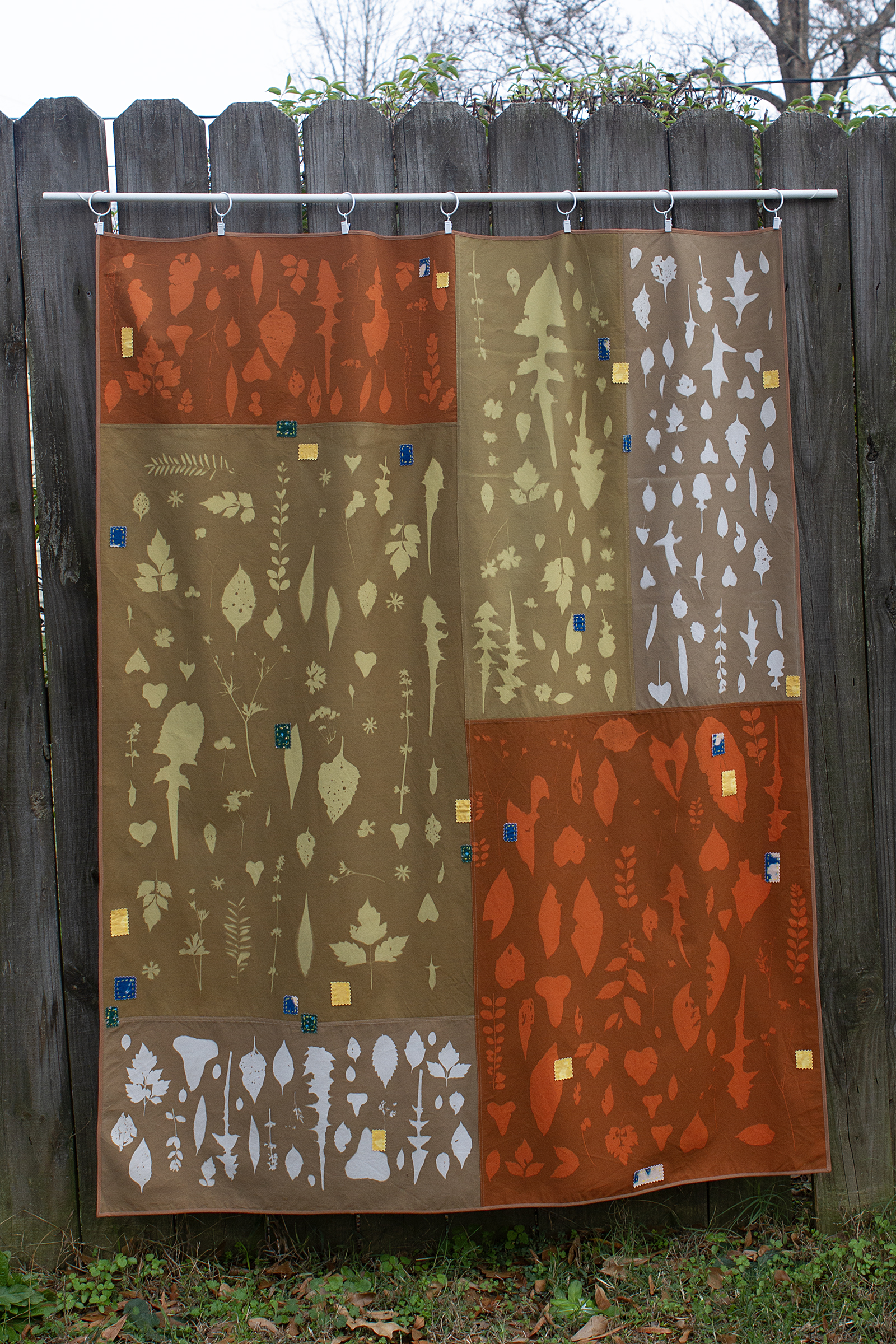 At the beginning of the pandemic, as an apartment dweller, I found myself dreaming about having my own yard. I longed for my own outdoor oasis, a place where I could lie down in the grass and watch the clouds go by or sip my morning coffee and read a book, without anyone else crossing the boundaries into my personal space. As I began working on my Yard Work pieces, the act of making them felt like daydreaming my perfect yard into existence through images that I collected and created. I pieced together photos of friends' outdoor spaces, imagining a space to garden and keep bees. I picked up bits of plant life from long walks on communal walking trails, bringing them home and reassembling them into something permanent in the form of cyanotype prints on fabric. Now it is a few years later and I do have a yard of my own. The immediate threat of the pandemic has passed but the appreciation for an outdoor space of my own has remained. In my current work I use those same photo processes to explore the act of slowly cultivating my yard into the space of my dreams.