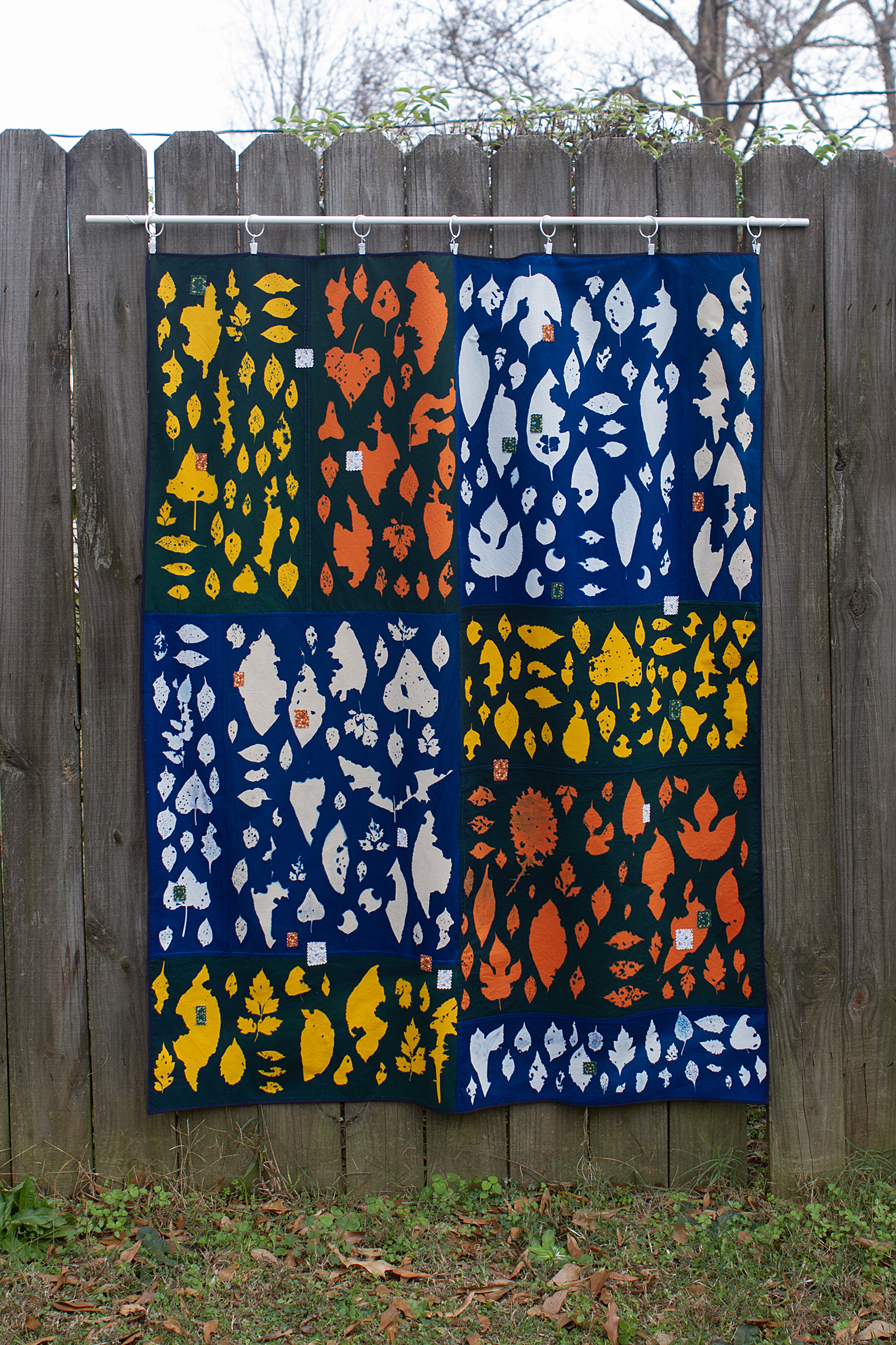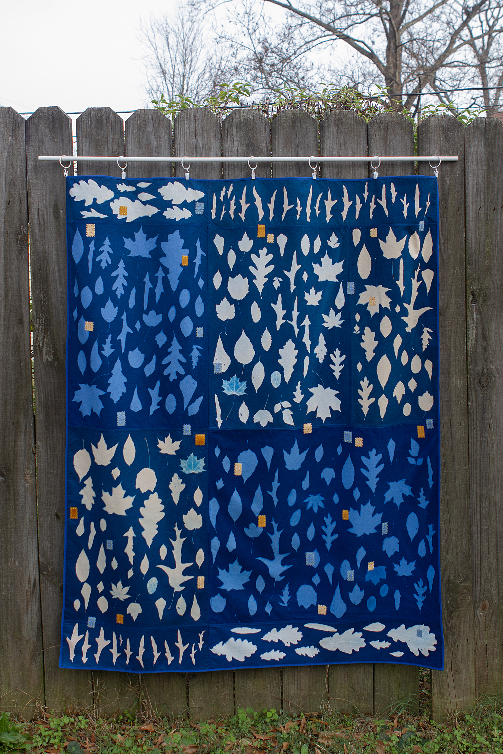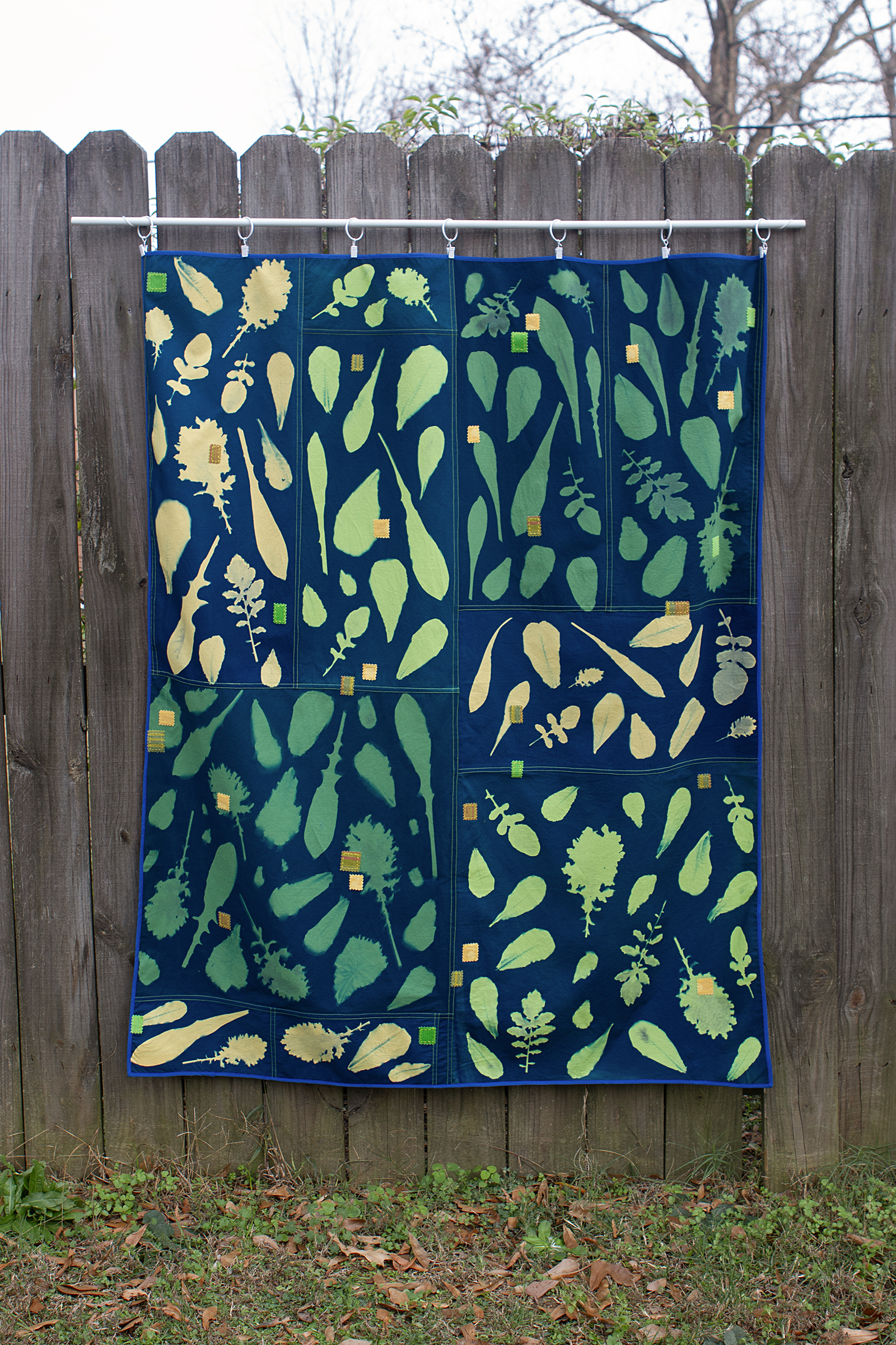 At the beginning of the pandemic, as an apartment dweller, I found myself dreaming about having my own yard. I longed for my own outdoor oasis, a place where I could lie down in the grass and watch the clouds go by or sip my morning coffee and read a book, without anyone else crossing the boundaries into my personal space. As I began working on my Yard Work pieces, the act of making them felt like daydreaming my perfect yard into existence through images that I collected and created. I pieced together photos of friends' outdoor spaces, imagining a space to garden and keep bees. I picked up bits of plant life from long walks on communal walking trails, bringing them home and reassembling them into something permanent in the form of cyanotype prints on fabric. Now it is a few years later and I do have a yard of my own. The immediate threat of the pandemic has passed but the appreciation for an outdoor space of my own has remained. In my current work I use those same photo processes to explore the act of slowly cultivating my yard into the space of my dreams.